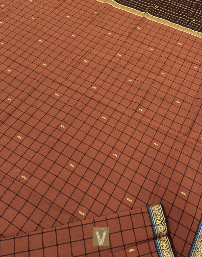 Deep rust handwoven Kasargod cotton sarees with self checks all over body and pretty border. The pallu is brown with stripes. This saree does not have running blouse and includes displayed kalamkari blouse. As these sarees are pure handloom cotton colour may breed in first few washes.