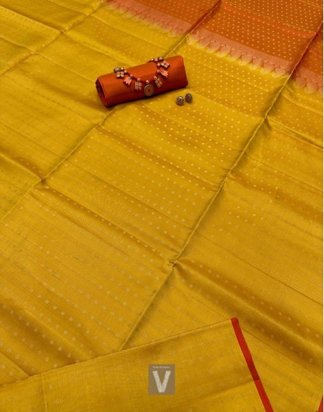 This Pure Kanchivaran handloom silk saree is mustard yellow with small gold jari butties all over body. The pallu is orange and features mango design and dots in gold jari weaves. Blouse is pallu colour kanchivaram silk . This saree may show colour variation as it’s dual shaded.
