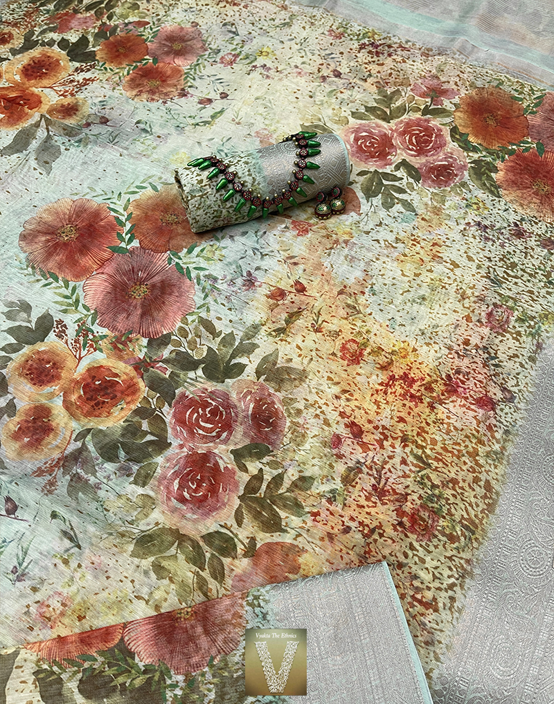 Sea green chanderi silk with digital floral prints and pretty zari border. The pallu features gold zari stripes with thread hangings. The blouse is printed with zari border.