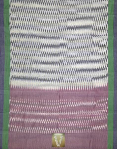 Pearl white double Ikkat mercerised cotton saree with purple-green border and pink pallu. Blouse is deep purple silk cotton.