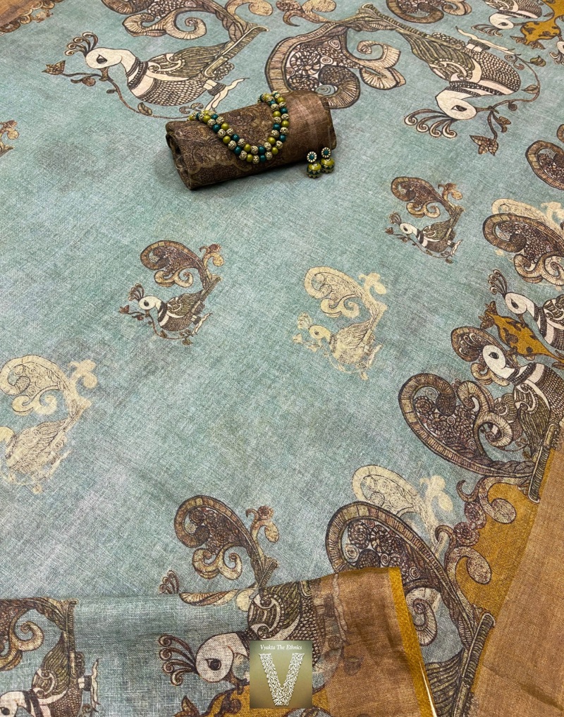 Pure linen light sea green saree with original digital kalamkari prints and mustard border. The blouse is linen with kalamkari digital prints.Jewellery is charged extra.