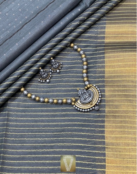 Grey cotton saree with jari stripes all over body. The pallu features stripes with gold chamki and blouse is plain with jari border and also includes displayed blouse.