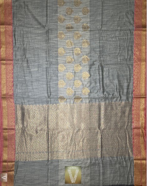 Tan colour silk cotton saree with woven jari butties in the center of body and pallu represents woven jari in geometric design. These saree are dark shades. Blouse is maroon silk cotton with woven jari butties all over.