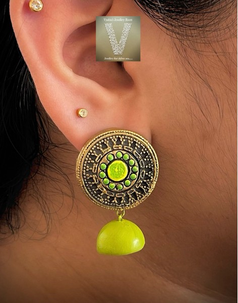 Antique gold and lime green round stud with lime green teracotta jhumka.
