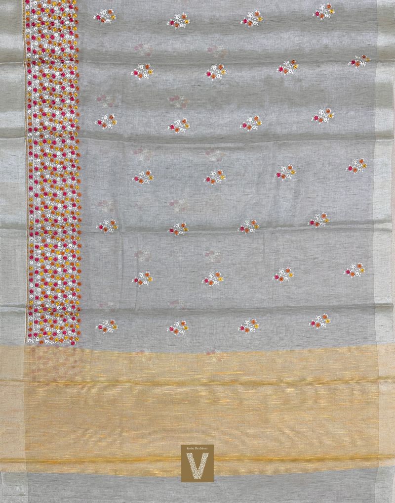 Silver tissue saree with red, yellow, orange and white floral embroidered and silver zari borders. Pallu features yellow tissue with self stripes. Blouse is yellow contrast tissue.